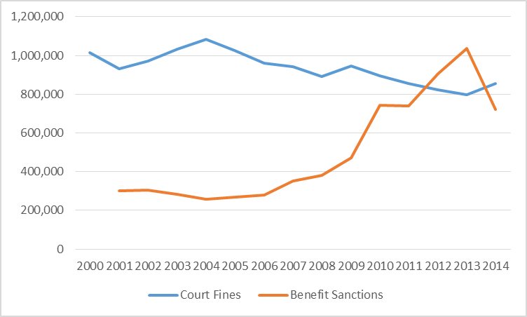 To put these figures into perspective, we can compare changes in the number of benefit sanctions with changes in the number of fines imposed in the criminal courts in the period since 2000. While the incidence of benefit sanctions in Great Britain increased from about 300,000 to more than 1,000,000 over the period 2001-2013, the incidence of fines imposed in the criminal courts in England and Wales decreased from about 1,000,000 to about 800,000. Although it is not generally known, the incidence of benefit sanctions overtook the number of court fines in 2012. The gap opened up in 2013 but the number of benefit sanctions fell quite sharply in 2014, due mainly to a fall in the number of unemployed people. However, the number of benefit sanctions is still very high indeed. These changes are shown in Figure 1.