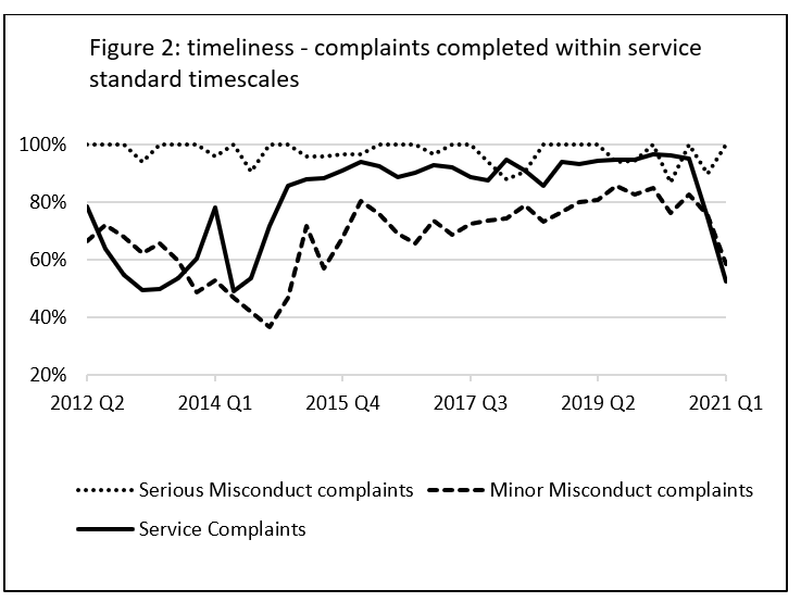 Figure 2 shows the proportion of complaints completed within service standards. The timeliness of service and minor complaints has varied significantly over time. By contrast performance on serious misconduct complaints, which are far fewer in number, has been relatively good. With service complaints, the volumes matter. The issues here include staff shortages within UK Visas & Immigration, high turnover of staff and the need to move staff around in response to backlogs and pressures as regards in immigration caseworking, a major area of activity for the department.