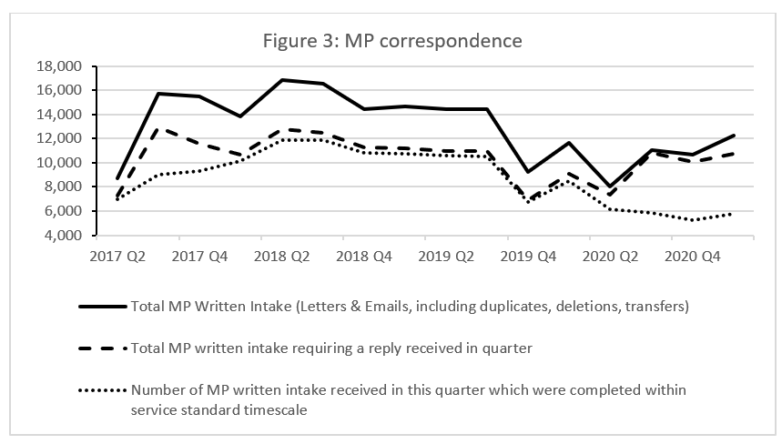 It is not just individual complaints. There is also a high volume of correspondence from MPs on behalf of their constituents. Figure 3 shows the amount of written correspondence to the department from MPs. The service standards for MP correspondence is: 95 per cent to be completed within a timescale of 20 working days.