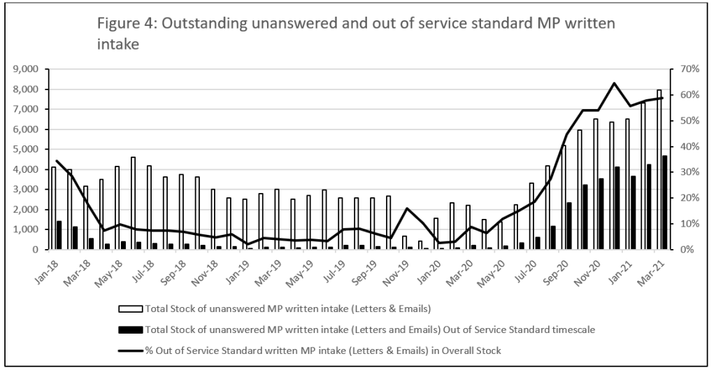 Figure 4 shows the number and proportion of unanswered MP correspondence that is outstanding and outside of the service standard that 95 per cent be completed within a timescale of 20 working days. It is quite apparent that with COVID, a substantial amount of outstanding MP correspondence has built up; about 60 per cent are now outside service standard.